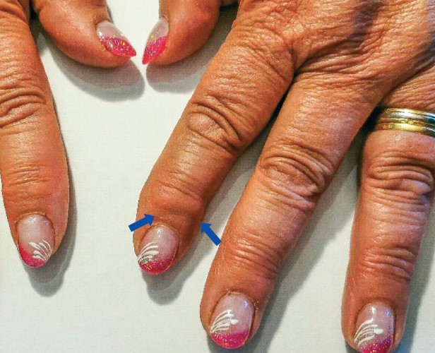 A 61-year-old female patient, with obesity and distal interphalangeal joint (DIPJ) osteoarthritis (OA) radiologically documented, presented with a painful and insidiou...