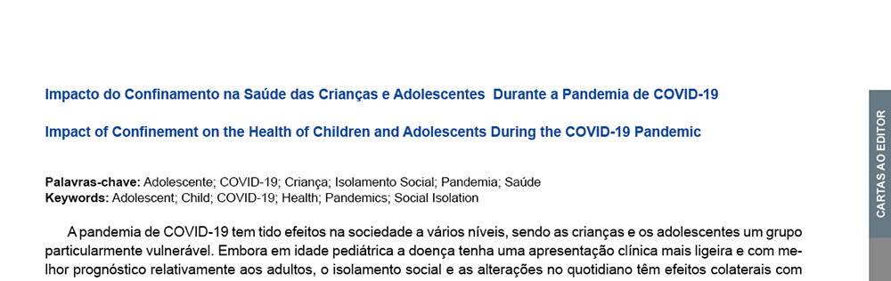 A pandemia de COVID-19 tem tido efeitos na sociedade a vários níveis, sendo as crianças e os adolescentes um grupo particularmente vulneráv...