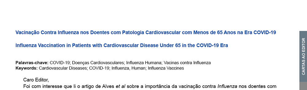 Foi com interesse que li o artigo de Alves et al sobre a importância da vacinação contra Influenza nos doentes com patologia cardiovascular. Para a...