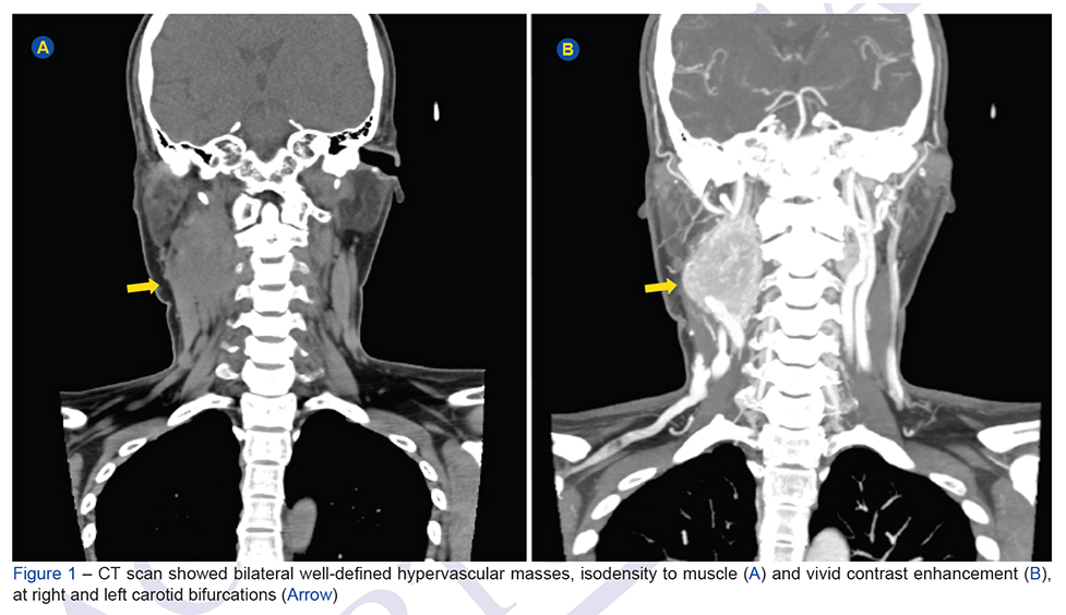 A 28-year-old woman presented with a 2-year history of a slow-growing, non-tender and pulsatile mass in the right carotid bifurcation. The computed tomography study re...