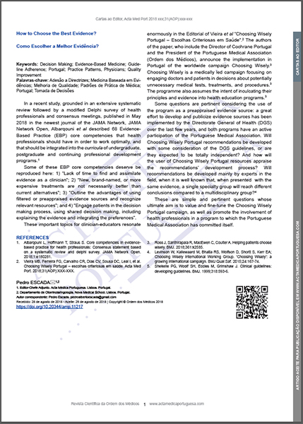 Keywords: Decision Making; Evidence-Based Medicine; Guideline Adherence; Portugal; Practice Patterns, Physicians; Quality Improvement