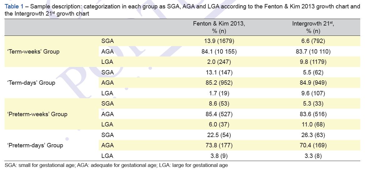 Results: A total of 14 056 newborns were included, 6% preterm. Using the Intergrowth 21st growth charts, the groups ‘Term-weeks’ (n = 12 081), ‘Term-days’ (n = 1118), ‘Preterm-weeks’ (n = 617) and ‘Preterm-days’ (n = 240), classified as small for gestational age according to the Fenton & Kim 2013 growth charts were adequate for gestational age in 52.8%, 57.8%, 37.7% and 9.3% respectively; and 9.2%, 9.2%, 5.9% and 0.6% of adequate for gestational age newborns were large for gestational age, respectively. In the ‘Pretermdays’ group, 7.9% of adequate for gestational age newborns were small for gestational age and 22.2% of large for gestational age newborns were adequate for gestational age, all with gestational age below 231 days.